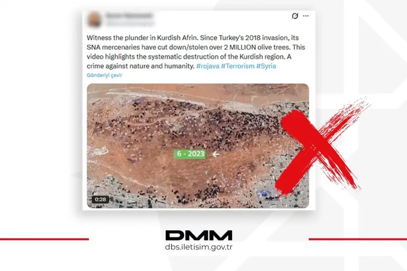 İletişim Başkanlığı Dezenformasyonla Mücadele Merkezi (DMM), sosyal medyada dolaşıma sokulan “Türkiye’nin Afrin’de 2 milyondan fazla zeytin ağacını kestiği” yönündeki iddiaların gerçeği yansıtmadığını duyurdu.