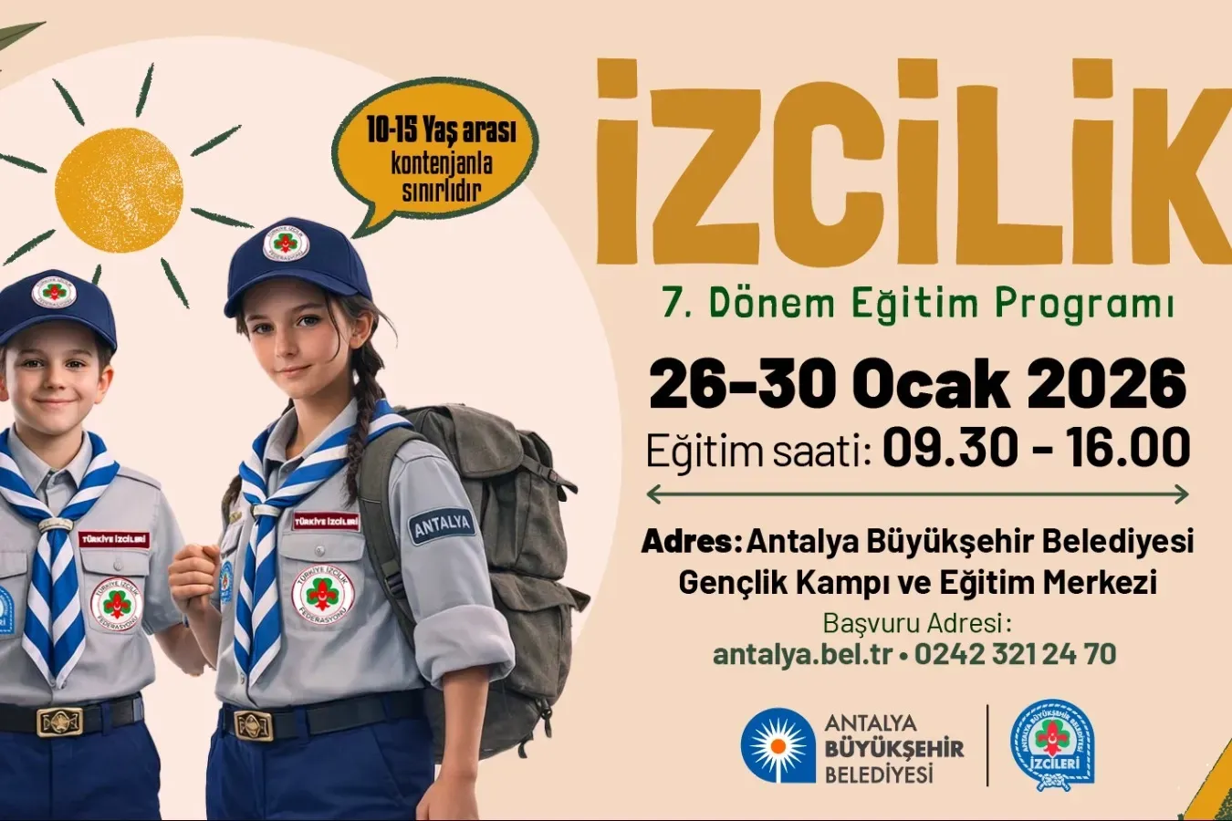 Antalya Büyükşehir Belediyesi tarafından, geleceğin izcilerinin yetiştirilmesi amacıyla 10-15 yaş arasındaki genç ve çocuklara yönelik düzenlenen 7. Dönem İzcilik Eğitim Programı’na başvurular başladı. İzcilik faaliyetleri 26 Ocak’ta başlayacak.