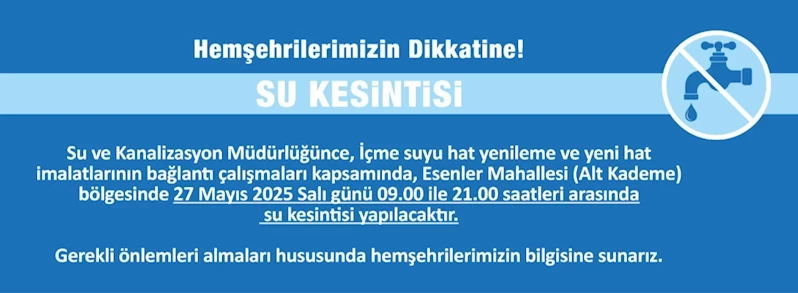 Su ve Kanalizasyon Müdürlüğünce, İçme suyu hat yenileme ve yeni hat imalatlarının bağlantı çalışmaları kapsamında, Esenler Mahallesi (Alt Kademe) bölgesinde 27 Mayıs 2025 Salı günü 09.00 ile 21.00 saatleri arasında su kesintisi yapılacaktır.